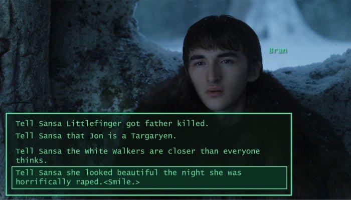 про то, как много знает Бран (раньше был моим любимым героем, а теперь разочаровывает, может Джона ждет, чтоб рассказать)